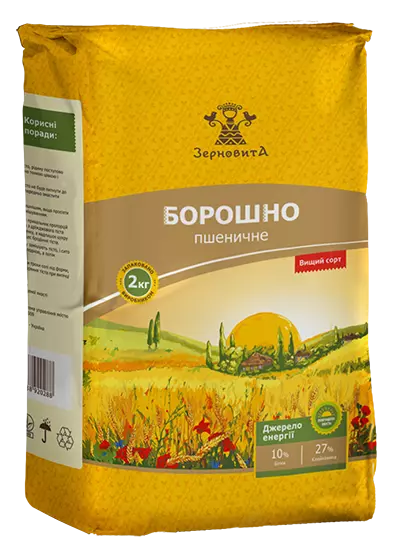Пшеничне борошно на 70% складається з вуглеводів – головного джерела енергії людини. Борошно ТМ «Зерновита» - вищого сорту, покращеної якості. Високий процент клейковини дозволяє отримати пружне еластичне тісто та пухку, пористу випічку з дріжджового, бісквітного, листкового, заварного чи пісочного тіста. Додаючи до борошна молоко, яйця, комбінуючи тісто з сирною, рибною, м’ясною начинками, підвищується біологічна цінність страв з борошна. Борошно ТМ «Зерновита» – вдалий вибір для при готування соусів, супів, макаронних виробів, млинців та оладок.