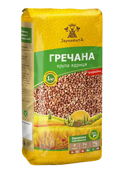 Крупа гречана ТМ «Зерновита» смачна, запашна та швидко вариться. Власне виробницто та контроль якості на всіх його етапах, орієнтація на відбірні сорти гречихи дозволяють отримати максимально якісне і чисте зерно. Гречана крупа - чемпіон серед злаків за вмістом вітамінів групи В, які покращують стан шкіри, підвищують стійкість до стресів. Гречана каша смакує, як основна страва з овочами, молоком та як основний інгредієнт котлет, пиріжків, запіканок, голубців.